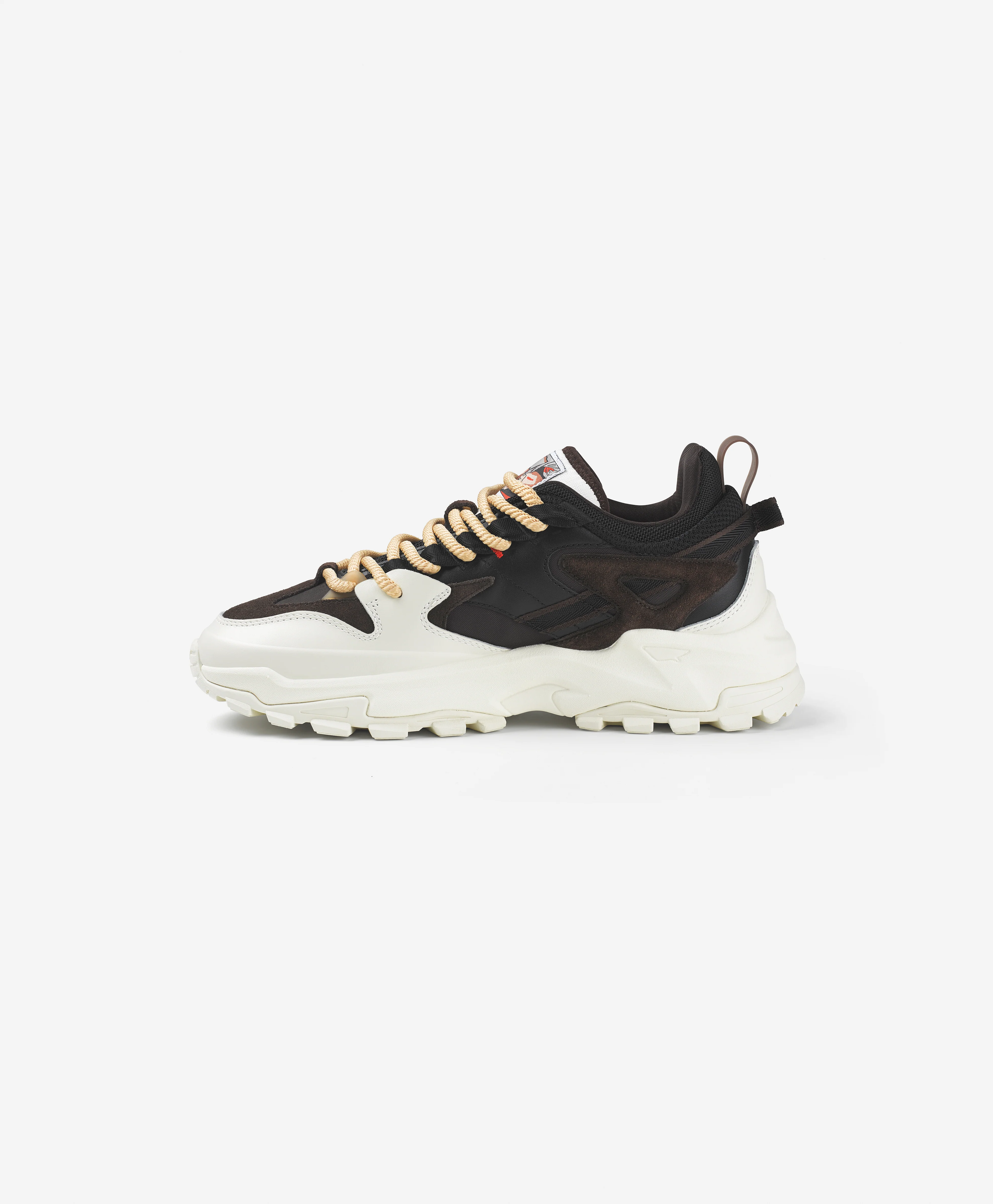 Mokka Phase 2 is here - richer, bolder, and brewed to perfection. The M1 LATTE blends rugged aesthetics with modern streetwear design, featuring rich brown suede, a robust nylon base, and sleek black leather overlays. An off-white toe cap and counter piece contrast against the warm tones, delivering a bold, chunky silhouette. Signature Coffee Tongue webbing returns with subtle colour tweaks, paired with caramel rope laces as a nod to the original Mokka.